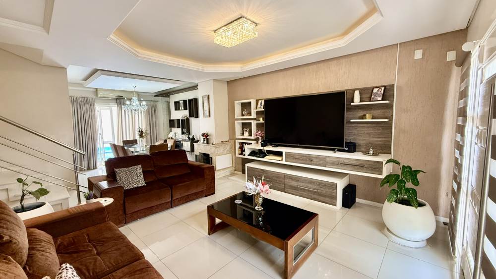 O living é espaçoso e aconchegante, com sala de estar com lareira integrada à sala de jantar, criando um ambiente perfeito para convivência, com acesso direto ao pátio.